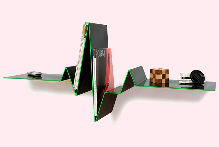 Обычные навесные полки – это уже слишком банально и скучно, даже для маленького интерьера. Поэтому дизайнеры предлагают украшать пространство необычными предметами, например, использовать для хранения книг функциональную, удобную и креативную полку в виде линии кардиограммы.