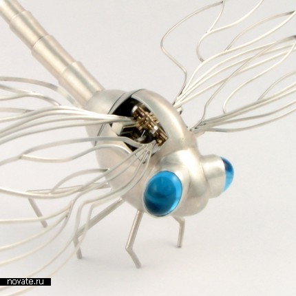 Правда, пока что, мягко говоря, не в массовом порядке. Если точнее, стрекозка, о которой идет речь, существует в единственном экземпляре. Ее автор, Джесс Денджер (Jesse Danger), сделал изящный механизм, повторяющий природные формы, вдохновившись главным образом проектами невероятных механизмов Леонардо да Винчи. Летать это милое существо не умеет, только машет крыльями, если поднять самый кончик ее «хвостика».