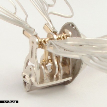 И стоит, надо полагать, весьма недешево. Неудивительно – ее внутренний механизм сделан из золота, а внешняя оболочка и крылышки – из очень дорогого серебра. Глазки – голубые топазы по десять карат каждый. Кроме того, все детали механизма и корпуса изготовлены и идеально точно подогнаны вручную (кроме двух шестеренок).