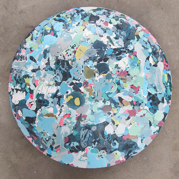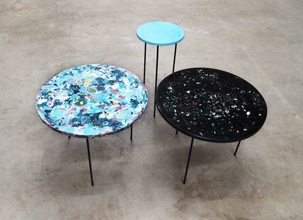 Яркие столики, будто залитые разноцветными пятнами краски, станут отличными акцентами в богемном интерьере. Столешницы сделаны из вторично переработанного сырья и напоминает о важности безотходного производства.