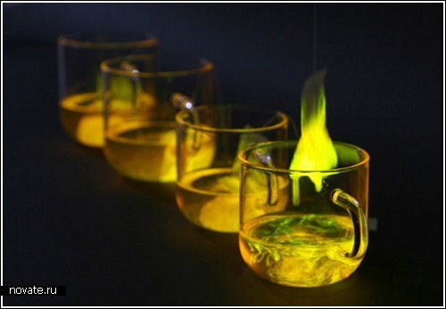 Пакет был наполнен флуоресцентными молекулами, которые, как известно, дают нам свечение. Если опустить этот «Светящийся пакетик» в химическую среду, чашка, полная химикатов, также будет светиться! Для удобства специально была взята прозрачная тара, которая позволяет рассмотреть в деталях, как же происходит процесс взаимодействия элементов. Конечно, вряд ли дизайнер открыл что-то новое в области химии, но идея интересная. По крайней мере, эти светящиеся чашечки смотрятся волнующе. Но пить после эксперимента чай из этой чашки точно не хочется.
