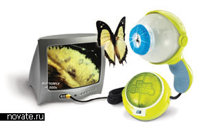 Глаз подключается к телевизору. Он попал в список за свою новаторскую идею: такая игрушка надолго заинтересует детей всех возрастов, включая совершенно "взрослых детей". Кроме того, это очень познавательная штука. Игрушка создает увеличенные изображения маленьких предметов. Это так здорово видеть на своем ТВ-экране увеличенные в 200 раз вещи! Оно даже включает в себя пробирку и блюдо для наблюдений жидкостей, соли, жуков, да всего, что только покажется вам любопытным. Три встроенных лампы освещают объект, находящийся под наблюдением.