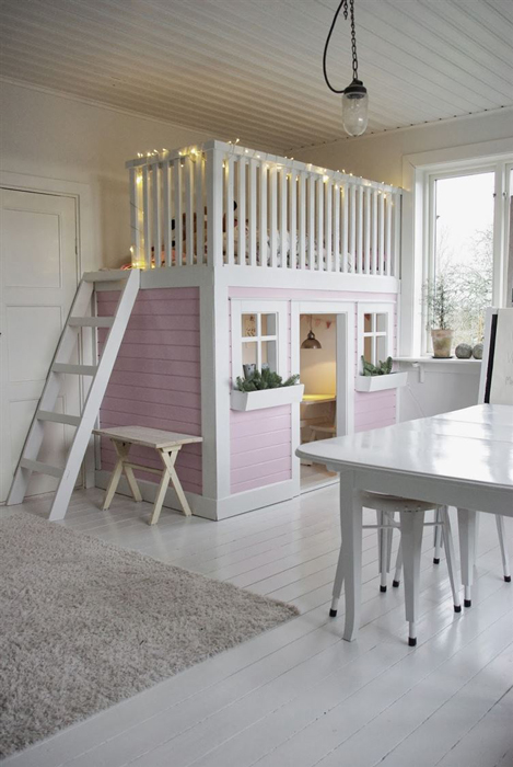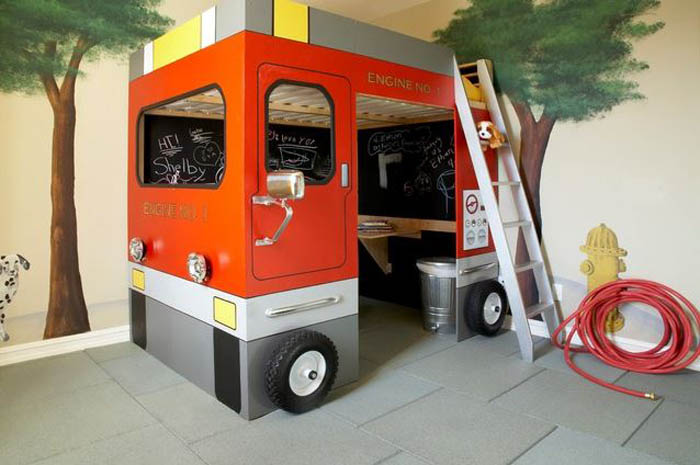 Мини-комната в виде пожарной машины приведет в восторг любого мальчика. Кроме внешнего оформления, дизайнеры хорошенько потрудились над внутренним убранством – стены «домика» покрыты грифельной краской, внутри установлены столы и стулья, а наверху находится удобная кровать.