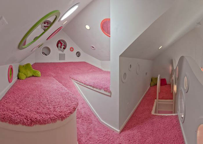Удивительная комната в мансарде похожа на футуристичный космический корабль с иллюминаторами, которые играют роль окон, зеркал или полок для игрушек.