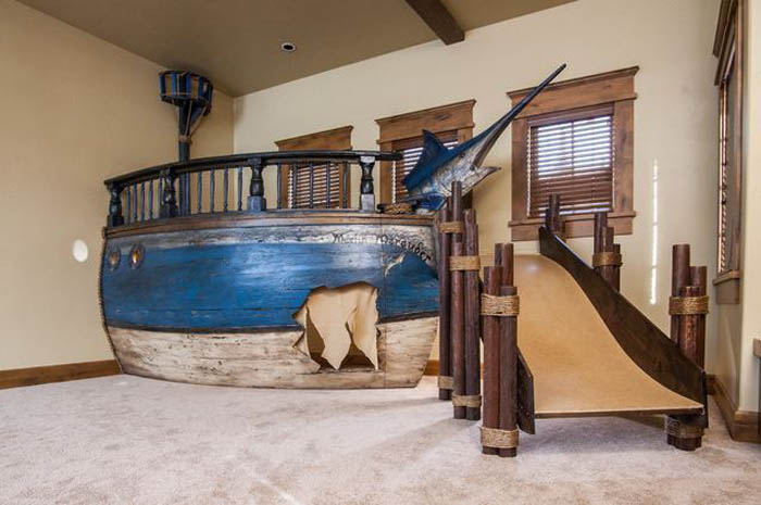 В этой комнате обосновался потрясающий корабль, на палубу которого ведет настоящая деревянная лестница.