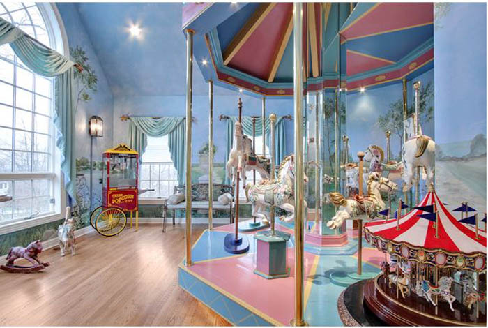 Совершенно сказочная детская, вызывающая ассоциации с волшебным замком, оборудована каруселью с изящно расписанными лошадками.