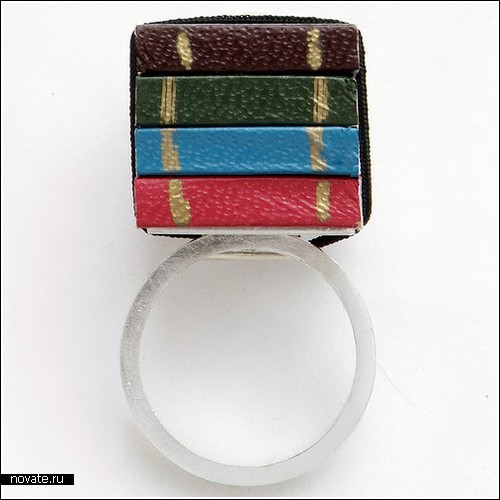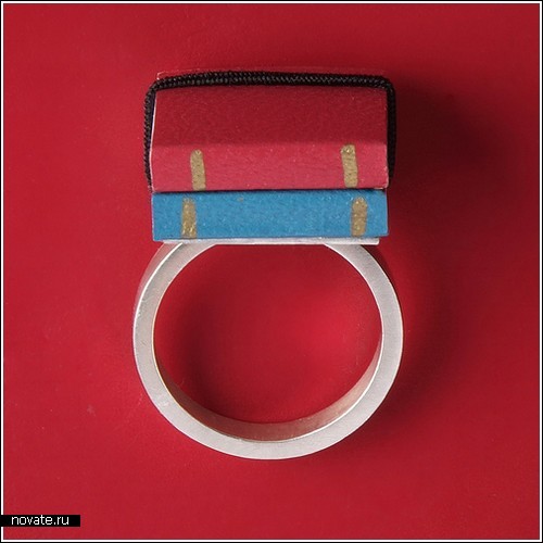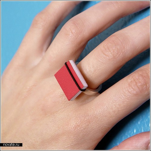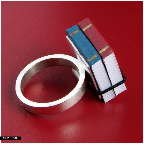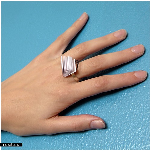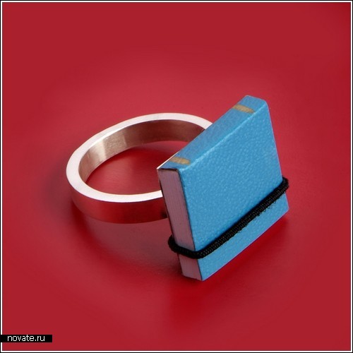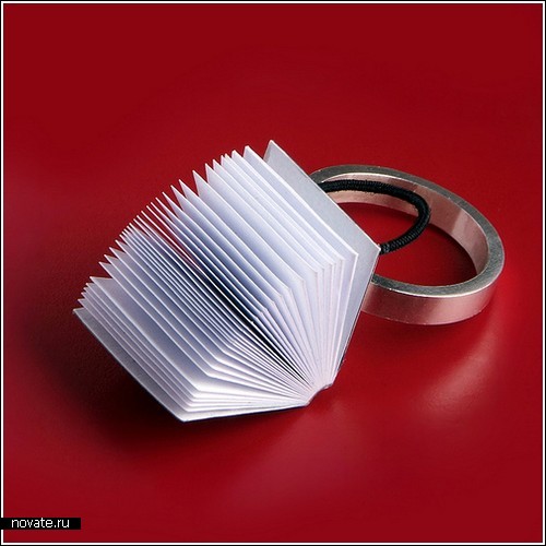 Если мысль о мусорке, которая может быть всегда буквально под носом, не очень обрадовала наших читателей, то мы можем предложить еще кое-что. Вернее, не мы, конечно, а дизайнер Ana Cardim, которой и принадлежит предыдущая идея, и сайт . Эту нельзя назвать совсем уж бессмысленной точно, ведь дизайнер умудрилась создать почти что портативный компьютер, который помещается в кольцо! Правда, никаких высоких технологий тут точно не обнаружится. В колечке нет ни бриллиантов, ни других камушков, ни надписей, ничего другого, а маленькая книжка. Очень-очень маленькая, созданная исключительно для таких целей, когда под рукой нет даже салфетки, а записать информацию нужно срочно. Что же мы делаем? Снимаем с книжки резинку, которая удерживает ее в таком отличном состоянии, раскрываем нужную страничку и пишем все, что нашей душе угодно. Правда, как показано на картинке, лучше взять гелевую или перьевую ручку, и чем тоньше она пишет, тем лучше. Объяснять зачем, думаю, не нужно.