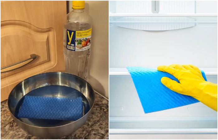 Возьмите миску, налейте в нее 100 миллилитров воды и пять столовых ложек уксуса. Хорошо размешайте, после чего смочите салфетку из микрофибры, отожмите и протрите все полки, стенки, резиновые уплотнители. Для очистки труднодоступных мест используйте ватные палочки, предварительно смоченные в растворе. После того, как полностью помоете холодильник, не закрывайте его – пусть проветрится примерно час-полтора.