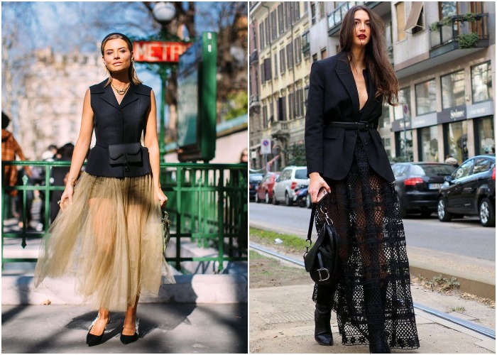 • Прозрачная юбка и пиджак оверсайз. Эта комбинация уже давно считается классической, поэтому смело берите ее на вооружение. Если хотите подчеркнуть талию, добавьте ремень, а чтобы ноги казались длиннее, наденьте босоножки или туфли на каблуке.