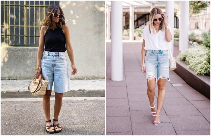 Этим летом короткие джинсовые шорты, которые плотно облегают попу и бедра, уже не в моде. Более стильными и комфортными моделями считаются свободные и длинные шорты, которые отлично сочетаются практически с любым верхом: топом, рубашкой, футболкой и даже строгим пиджаком. Кстати, если у вас на работе нет строгого дрес-кода, вы вполне можете составить деловой образ с шортами, чтобы показать свои красивые, стройные ноги. А если хотите отправиться на вечеринку, тогда в качестве верха выбирайте женственное боди. В качестве обуви идеально подойдут мюли, туфли на танкетке или каблуком kitten heel.