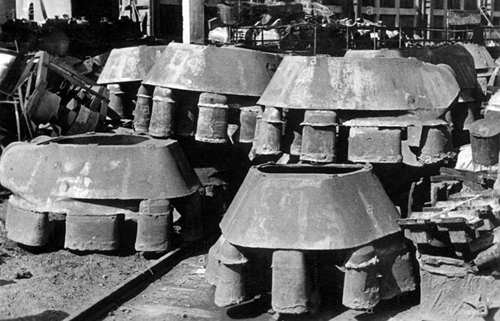 Но использовать этот метод для башен было сложно. Прокатка предполагала работу с относительно тонкими листами, тогда как башням требовались массивные, монолитные элементы. Кроме того, изготовление башни из катаных листов потребовало бы сложной и дорогой сварки, ослабляющей конструкцию. Поэтому инженеры выбрали литьё: расплавленный металл заливали в форму, получая деталь нужной конфигурации. Это позволяло создавать округлые и обтекаемые башни, способные лучше отклонять снаряды. Чтобы увеличить защиту литых башен, металл подвергали дополнительной термообработке. В процессе медленного охлаждения в нём формировалась более устойчивая структура, уменьшая вероятность растрескивания. Кроме того, в некоторых случаях наружный слой упрочняли, сочетая его с более пластичной внутренней частью. Такой подход обеспечивал литым башням достаточную прочность, несмотря на их меньшую твёрдость по сравнению с катаной бронёй корпуса.