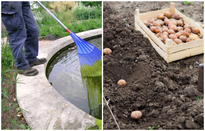 Также приходит время очистки декоративных водоёмов и бассейнов от веток, листьев и прочего сора, протереть стенки от пыли и собравшейся гряди, а затем заново наполнить водой. После этого можно приступать к посадке водной растительности. Май отлично подходит для возвращения тех культур, которые зимовали не в пруду. Также можно добавить в пруд растения оксигенаторы, контролирующие чистоту воды. А у зимующих в пруду необходимо обрезать длинные стебли.