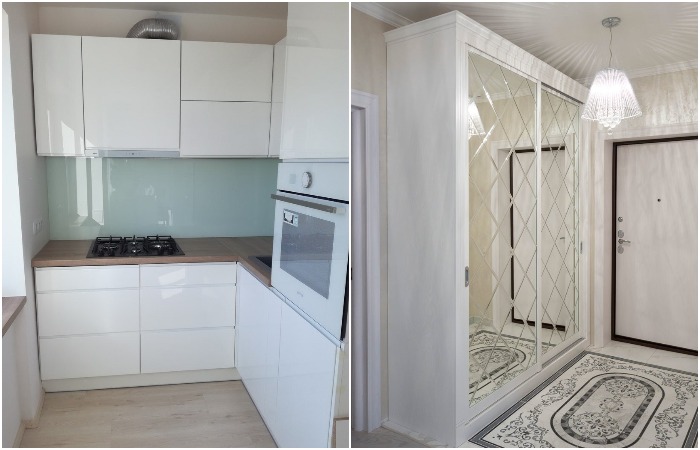Зеркальный шкаф в прихожей и глянцевый кухонный гарнитур