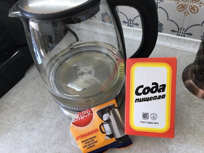 Если у вас электрический чайник, нагрейте в нем литр воды, а затем добавьте столовую ложку соды. Повторно кипятить жидкость не надо – сода будет работать в то время, пока вода остывает (обычно процедура занимает около часа). На финальном этапе промойте чайник фильтрованной или дистиллированной водой и прокипятить несколько раз, каждый раз сливая жидкость.