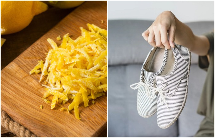 Мы привыкли, что в быту обычно используется лимонный сок или лимонная кислота, но цедра также является весьма полезной. Например, ее можно использовать, чтобы освежить обувь. Итак, для начала нужно снять цедру с лимона. Лучше всего это делать с помощью терки, и так, чтобы на ней не осталось мякоти. Далее равномерно распределите «стружку» по стельке и оставьте на ночь.