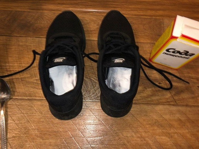 Равномерно распределите по стельках по одной столовой ложке соды, вынесите обувь на балкон и оставьте там на ночь. Утром вам останется лишь стряхнуть со стелек остаток соды, надеть кроссовки и пойти по своим делам.