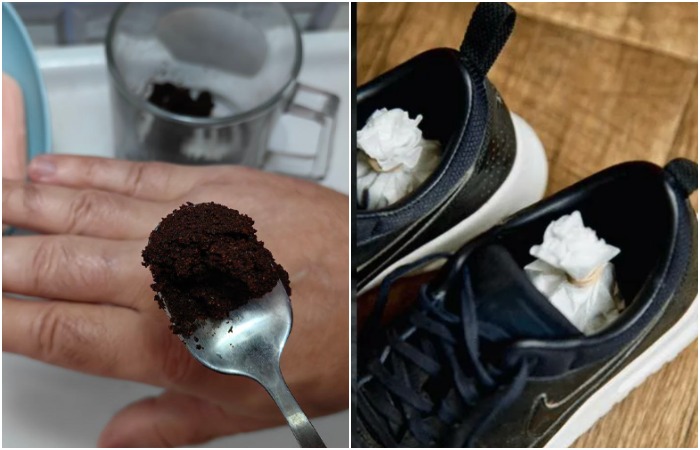 Заверните кофейную гущу в марлю и поставьте в обувь