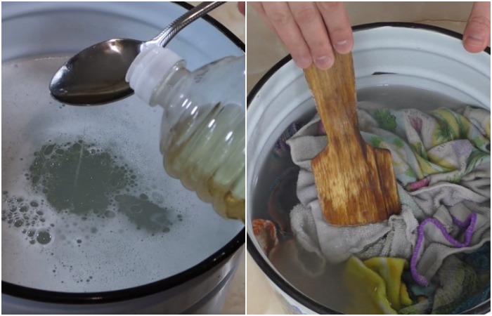 Также можно прибегнуть к способу, который активно использовали наши мамы и бабушки. Мы говорим о кипячении. Поставьте кастрюлю с водой на плиту, доведите ее до кипения, добавьте мерную ложку стирального порошка и две столовых ложки растительного масла. Опустите полотенца, убавьте огонь и кипятите их примерно два часа. Затем выключите плиту, остудите полотенца и прополощите в чистой воде. Обратите внимание, что для этих целей нельзя использовать стиральный порошок для ручной стирки, так как он слишком сильно пенится.