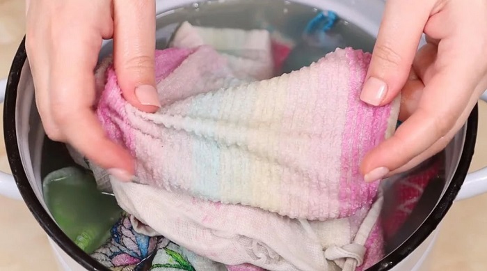 Замочите в ведре кухонные полотенца вместе с растительным маслом