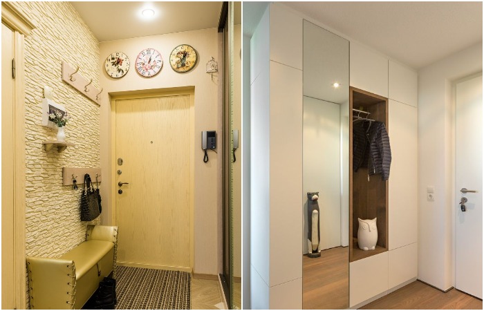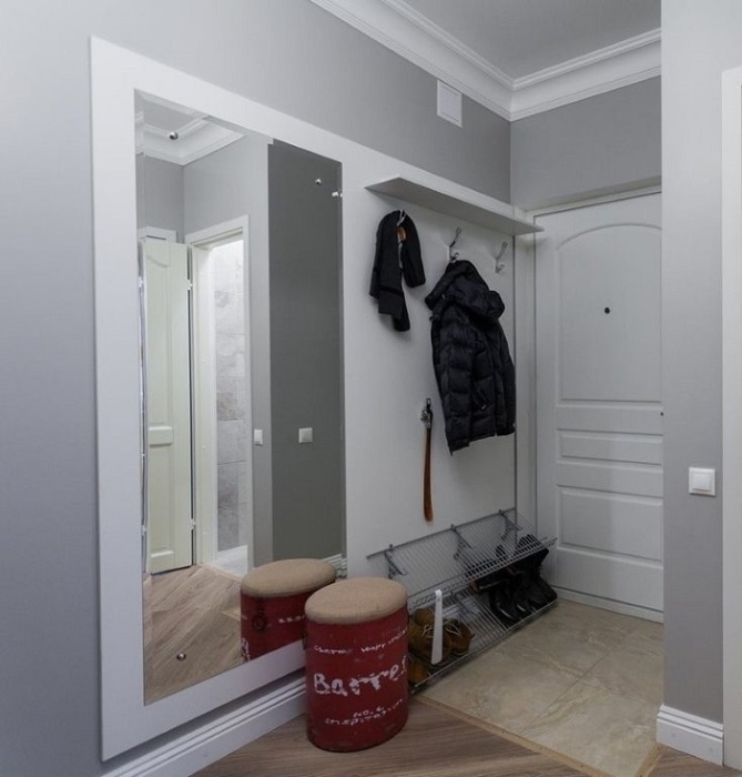 Какие есть варианты решения проблемы? Первый и самый простой – купить шкаф с зеркальными дверцами. Кстати, он еще и решит вопрос с маленькой площадью комнаты, так как сможет визуально увеличить ее. Второй вариант – выделить на стене место под большое зеркало, можно даже от пола до потолка, если позволяет планировка. Третье решение – зеркало на двери. Обычно к нему прибегают, если стены заняты. Выбирайте то, что больше всего вам по душе и подходит конкретно для вашей прихожей.