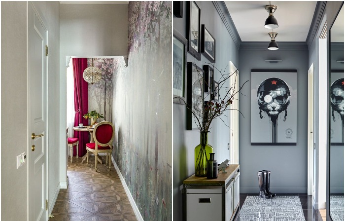 Первое, что видит человек при входе в квартиру – это прихожая. И здесь очень важно установить какой-то зрительный ориентир, который будет привлекать взгляд. Идеальной фокусной точкой станет выход на свет. Например, если впереди располагается комната с окном, установите двери со стеклянными вставками, которые будут пропускать солнечный свет, или вообще уберите их. Если же планировка квартиры не позволяет логически связать коридор с жилой комнатой, тогда используйте в качестве акцента какую-нибудь картину, зеркало в оригинальной раме, яркий пуфик или комод.