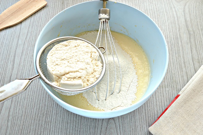 • Подготовьте яично-сахарную смесь с добавлением молока и просейте в эту массу муку. Лучше делать это постепенно, всыпая муку частями и перемешивая после каждого этапа. Это нужно для однородной консистенции.