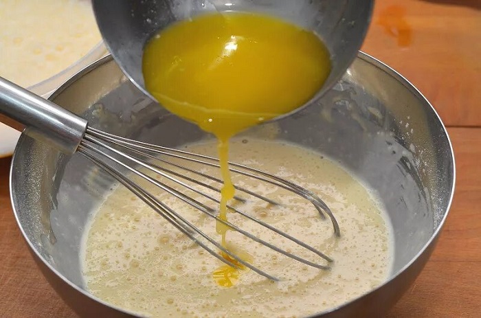 Масло в тесто добавляется самым последним. Мы уже говорили, что оно может быть либо сливочным, либо растительным. Первое сделает блины более нежными и красивыми, второе не даст тесту прилипнуть к сковороде.