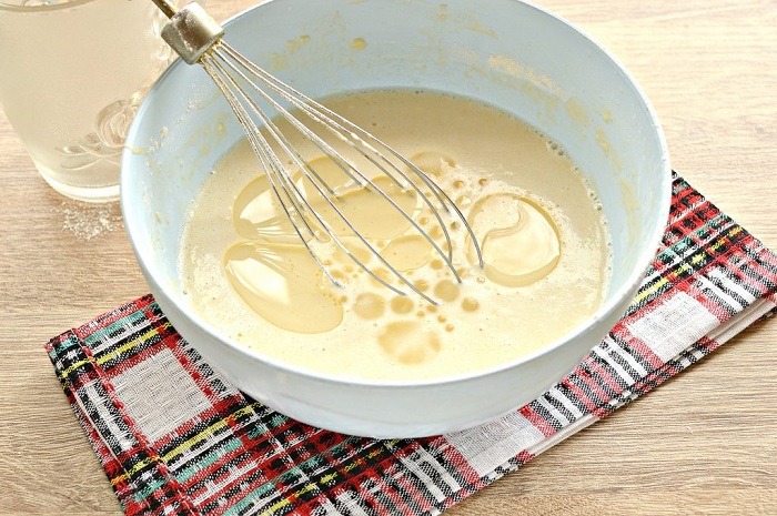• Нужно взбить яйца с сахаром и солью, добавить молоко и постепенно, тонкой струйкой, вливать готовую смесь в просеянную муку, тщательно перемешивая тесто, чтобы не образовались комочки.
