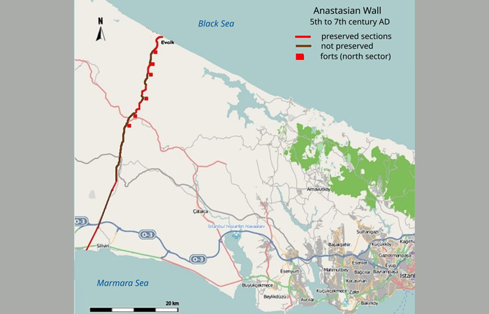 Когда в V веке римская традиция обороны перешла к Византии, император Анастасий I решил обезопасить столицу не только мощными стенами, но и внешним рубежом. Так появилась линия укреплений длиной почти 50 километров, пересекавшая Фракию от Чёрного до Мраморного моря. Расчёт был прост: если враг направится к Константинополю, пусть сначала столкнётся с этой преградой.