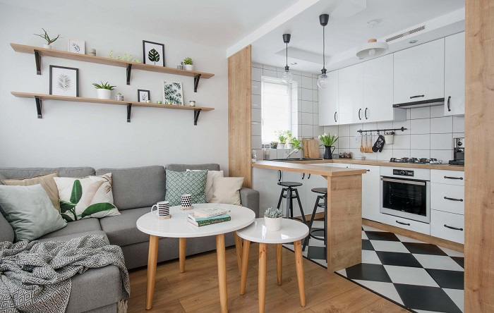 Речь идет о планировке комнаты. Если вы объединяете кухню с гостиной, важно подумать, сколько места вы сможете выделить для одной зоны, сколько – для другой, и останется ли еще свободная площадь, например, для мини-кабинета. Отлично, если комната в квартире изначально прямоугольная – тогда вы сможете пропорционально разделить ее на две части и разместить все необходимое.