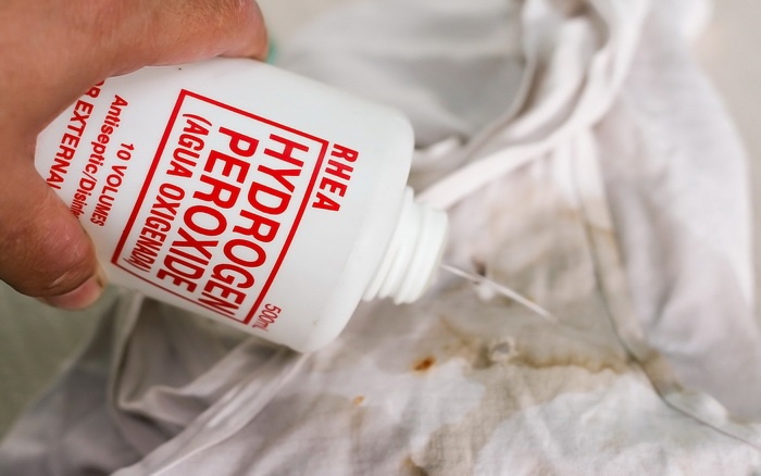 Обратите внимание: Перекись водорода обладает отбеливающим эффектом, поэтому если будете использовать ее для цветных и темных тканей, обязательно протестируйте средство на незаметном участке ткани.