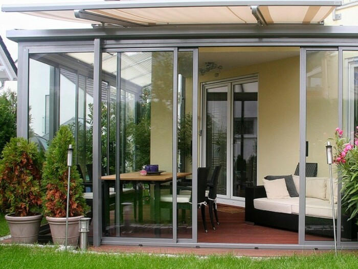 Способы остекления тоже разнятся, один из наиболее популярный это холодный. Такие варианты как правило лёгкие и отлично подходят для тех домов, где хозяева живут только в летнее время года. Фундамент под этот тип не обязательно должным быть очень прочным, а основная функция будет заключаться в защите помещения от ветра. Алюминиевое остекление будет тем же самым, которым стеклят лоджии, обычно такие окна раздвижные или распашные, а уплотнение имеют щёточное. Благодаря этому присутствует немного утепления, но подходящее только для летнего периода. Температура на такой террасе будет держаться около восьми градусов относительно уличной.