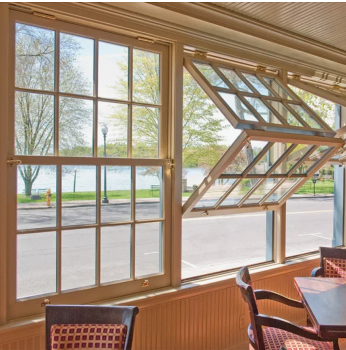 Откидные и поворотные варианты хоть и менее востребованы из-за сложности конструкции, всё-таки тоже являются подходящим для некоторых. Такие системы могут быть частичными, например откидываться только верхняя часть окна, что будет отвечать за проветривание помещения. При этом поворотные способны открываться как внутрь, так и наружу, они уже будут открывать створки.