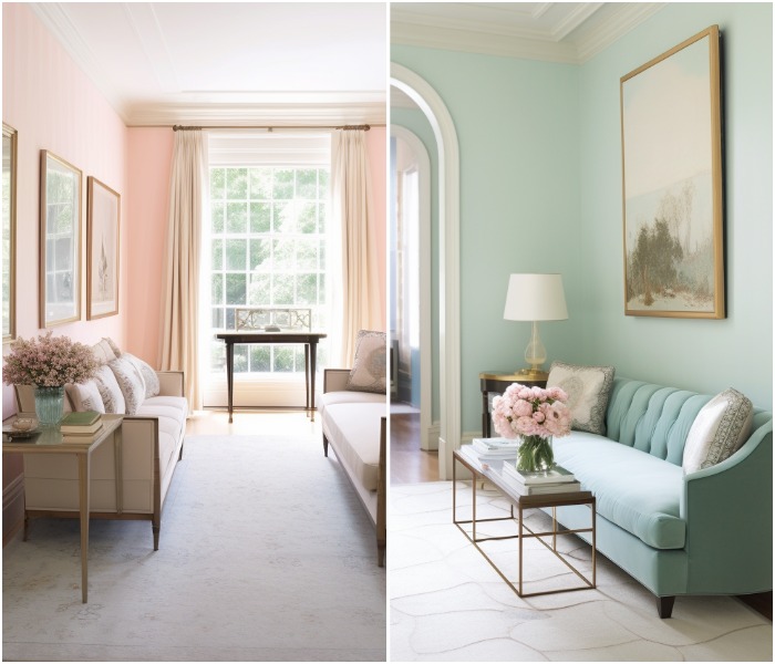 Варианты гостиной в розовых и мятных тонах. / Фото: gp-decor.ru