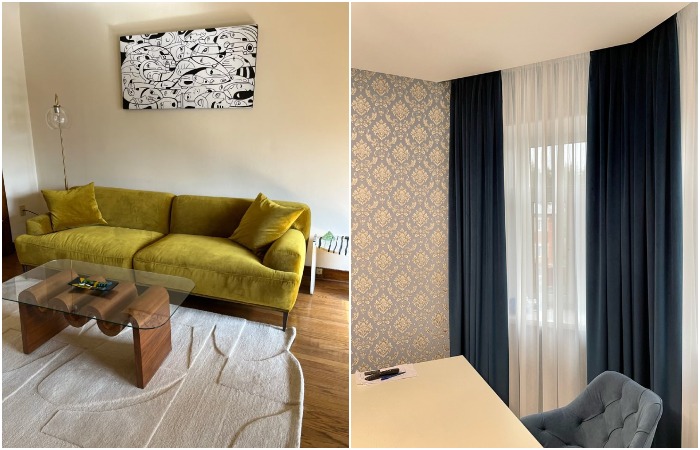 Чтобы выбранная мебель и текстиль не казались устаревшими, постарайтесь гармонично скомбинировать современные тренды и модные приемы из 90-х. Например, уже много сезонов подряд популярной является плюшевая и бархатная обивка мягкой мебели. Важно выбирать правильный оттенок, чтобы это выглядело стильно, а не устарело. Горчичный, светло-голубой, изумрудный – это благородные цвета, которые привнесут в интерьер нотку роскоши, но не сделают его помпезным.
