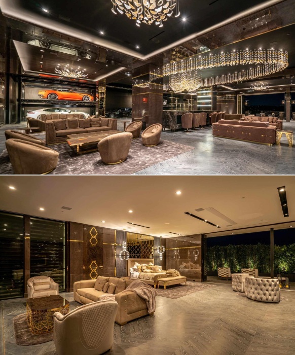 При этом не забыли задействовать и подвал, куда приведет если не мраморная лестница, так доставит лифт. Владельцам и их гостям доступно: несколько гостиных с удобными и дорогими диванами, целый комплекс, состоящий из нескольких бассейнов и благоустроенных зон отдыха, оформленных в античном стиле, СПА-салон, сауна, паровая баня, джакузи и массажный кабинет. Рядом с бассейном обустроена потрясающая зона отдыха с игровой комнатой, тренажерным залом, баскетбольной площадкой, кинотеатром на 30 человек, дегустационным залом в окружении бутылок с дорогущими и изысканными напитками. На этом удобства, вызывающие восторг, не заканчиваются. На подземном уровне также имеется боулинг, претендующий на звание одного из самых шикарных на планете, мраморная галерея суперкаров и сцена для выступлений.