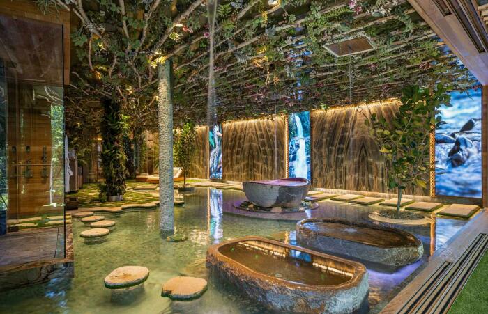 Спустившись под землю, владельцы и гости попадают в роскошные лаундж-зоны, одна из которых приведет в самый удивительный СПА-«курорт» в частном доме. Он спроектирован так, чтобы обеспечить «водные приключения» с оздоровительными процедурами и развлечениями в горячих и холодных бассейнах, гидротерапевтической камере или джакузи. Но все же самой главной изюминкой этой зоны стали пышные композиции из живых растений, включая даже потолок. Все зоны оснащены мультимедийными экранами, на которых воспроизводятся видеоролики с тропическими пейзажами, что создает поистине захватывающие ощущения. Помимо этого в подвале оборудованы: кинозал, джаз-клуб, бар и автогалерея с местом для шести автомобилей.