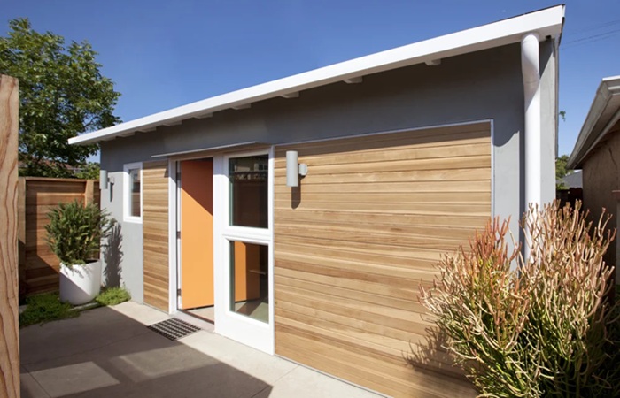 Лицевой фасад преображенного гаража обшит кедровыми досками (Ladera Heights ADU).