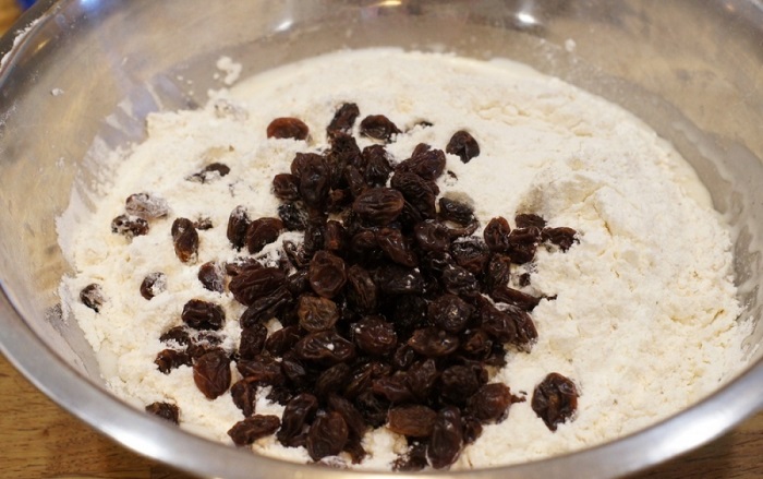 Сначала смешайте изюм с мукой, а затем добавляйте его в тесто. / Фото: bibia.ru