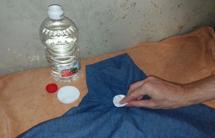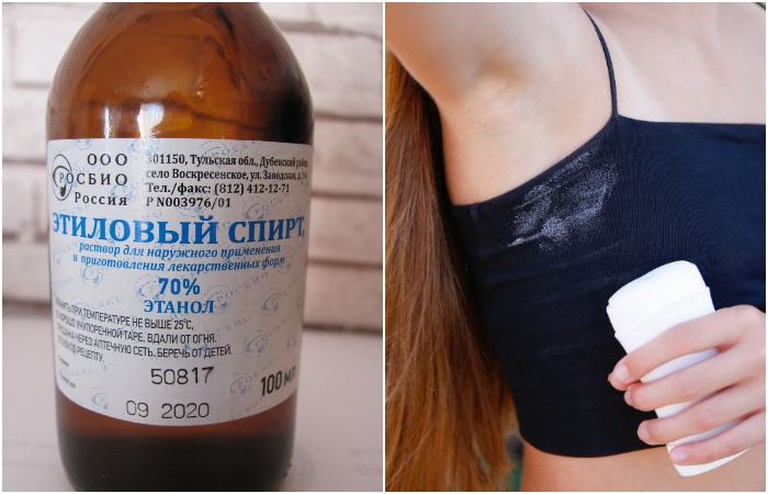 Если на любимом черном платье или футболке остались белые следы от дезодоранта, которые не получилось вывести даже после стирки, самое время воспользоваться помощью спирта. Возьмите медицинский спирт или обычную водку, налейте небольшое количество на загрязненный участок и подождите несколько минут. Этого времени должно хватить для того, чтобы средство разъело пятно.