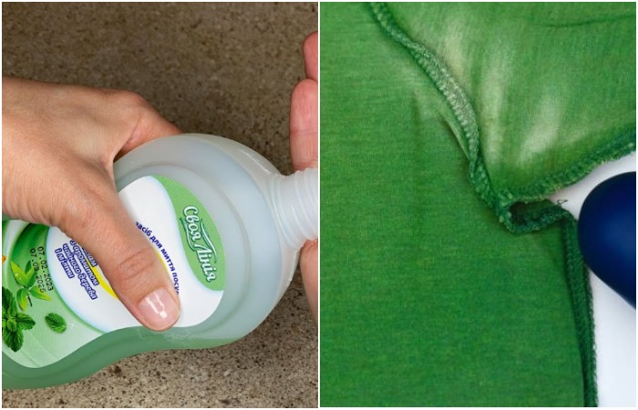 Дома может не оказаться лимона или медицинского спирта, но жидкость для мытья посуды есть практически всегда. Поэтому смело можете использовать ее для борьбы с пятнами и некрасивыми разводами – она справится не хуже других средств. Лучше всего со следами от дезодоранта справляются составы с глицерином, но другие также являются эффективными.
