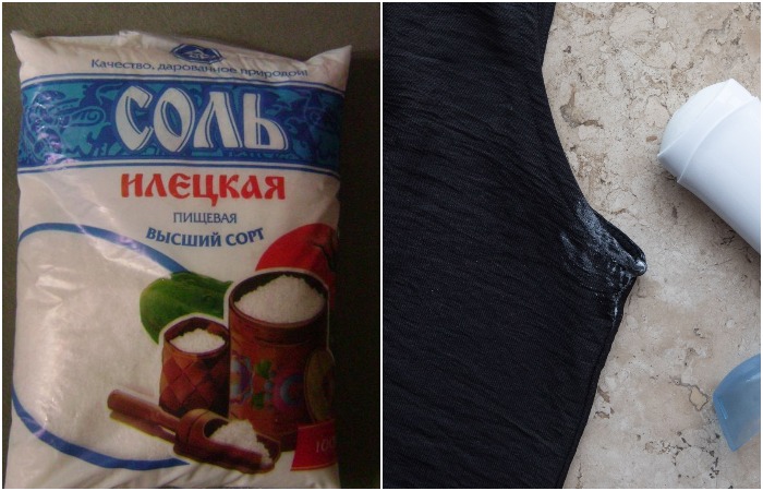 Когда речь идет об удалении белых пятен с одежды, соль является самым эффективным помощником. Она пригодится в том случае, если нужно привести в порядок черные вещи. Итак, обильно смочите загрязненный участок водой, посыпьте его солью и оставьте на несколько часов, а лучше на ночь. Утром вновь смочите ткань и потрите ее солью.