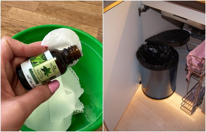 Положите в мусорное ведро ватные диски, смоченные эфирным маслом