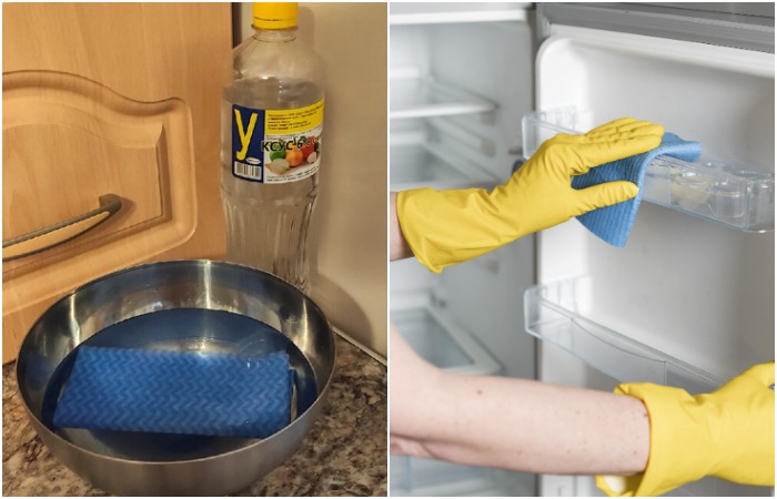 Открыли дверцу холодильника и почувствовали, как в нос ударил резкий неприятный запах? Скорее всего, дело в испорченных продуктах. Для начала нужно найти и выбросить ту еду, которая пришла в негодность, а затем приступить к уборке холодильника. Все, что вам нужно сделать – смешать уксус и воду в равных пропорциях, смочить мягкую тряпку, хорошо отжать ее и тщательно помыть полки и стенки холодильника.