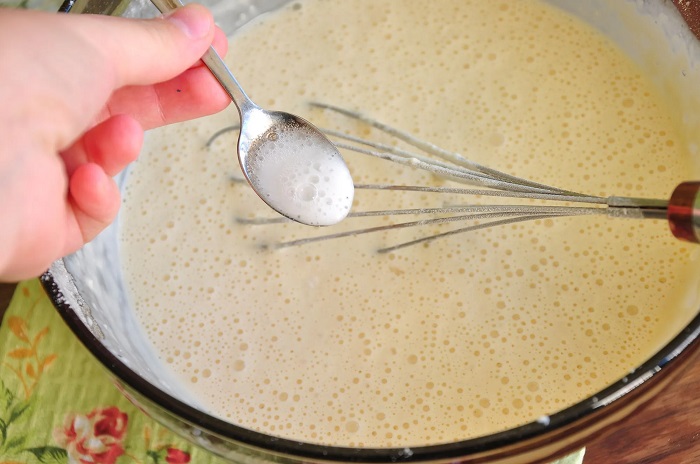 Идеальное решение – налить в миску необходимое количество кефира, добавить в него половину чайной ложки соды, размешать и оставить минут на 15, чтобы началась полноценная реакция. После этого в миску можно класть остальные ингредиенты. Кстати, их лучше не миксером, а венчиком или ложкой – тогда продукты лучше объединятся между собой и оладьи получатся пышнее.