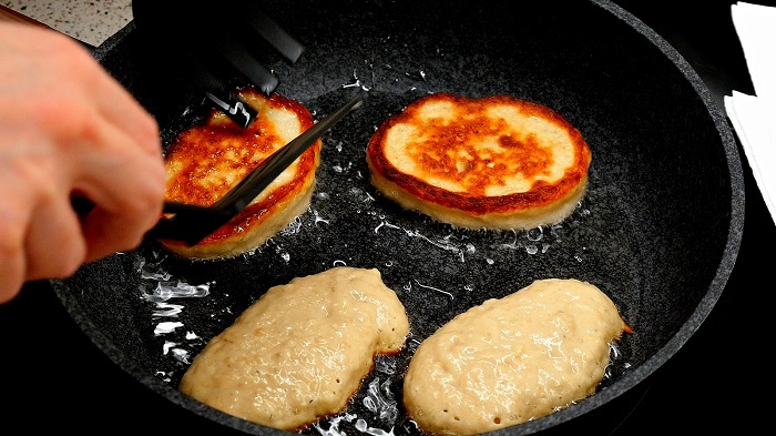 В отличие от блинов, которые принято жарить на сковороде с антипригарным покрытием, для оладий лучше использовать чугунную. Она равномерно прогревается, а за счет толстых стенок хорошо держит температуру, благодаря чему оладьи равномерно пропекаются. Обратите внимание, что растительного масла должно быть ровно столько, чтобы оно покрывало примерно ¼ часть оладушка, не меньше. Первая порция теста должна попасть на сковороду в тот момент, когда масло начало пузыриться. Тогда оно сразу схватится, а не будет «киснуть», плюс оладьи будет гораздо проще переворачивать.