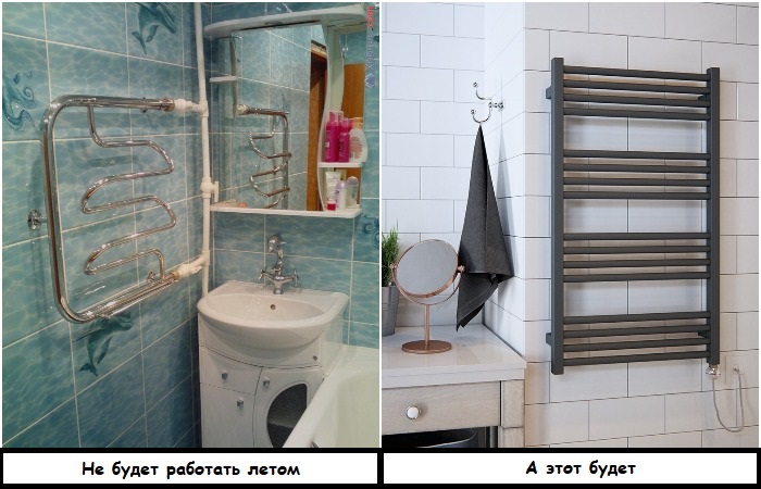 Однако, несмотря на очевидные плюсы, есть у такого решения и минус, который является достаточно весомым. Когда отключают отопление, полотенцесушитель перестает работать, а в ванной сразу становится сыро и холодно. С учетом того, что именно этот прибор отвечает за быстрое испарение влаги и, как следствие, отсутствие плесени, хотелось бы, чтобы он работал круглый год.