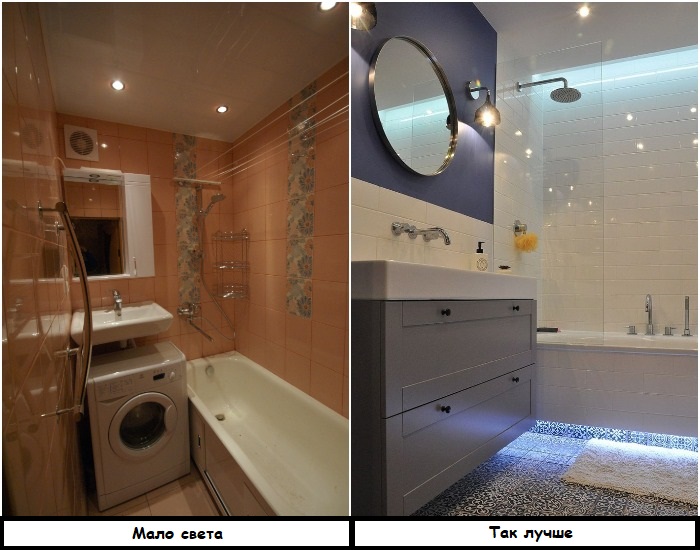 Поэтому позаботьтесь о том, чтобы в ванной было несколько светильников. Можно повесить диодную ленту по периметру шкафчиков, подсветить зеркало сверху или по бокам. Выбирайте тот вариант, который больше всего нравится.