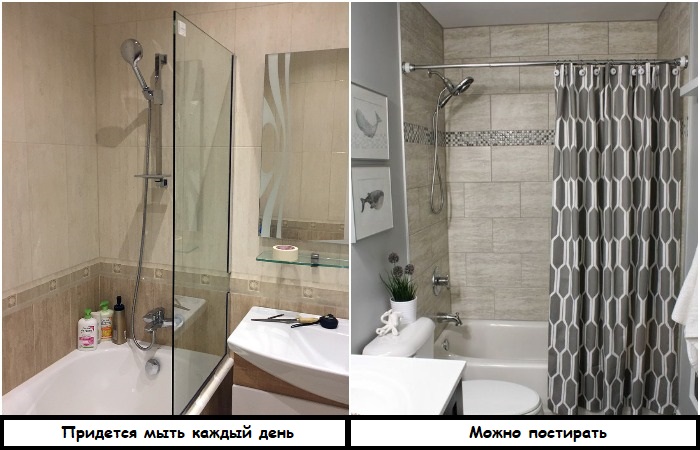 Во-первых, если выбрать маленькое стекло, оно практически не будет защищать от воды, а из-за большого будет неудобно залезать в ванну. Как вариант – установить раздвижную конструкцию, но она быстро выйдет из строя. Во-вторых, стекло сложное в уходе. На нем остаются потеки и разводы от воды, которые нужно убирать после каждого душа. Если этого не сделать, пятна засохнут и от эстетической картинки ничего не останется.