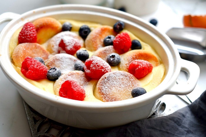 Переходим к приготовлению заливки. Смешайте все нужные ингредиенты при помощи венчика, чтобы получилась однородная масса, вылейте в жаропрочную форму, разровняйте лопаткой, после чего аккуратно выложите поверх сырники. Запекайте их в духовку, разогретой до 180 градусов, примерно 20 минут. По желанию оформите готовое блюдо ягодами и топпингом.